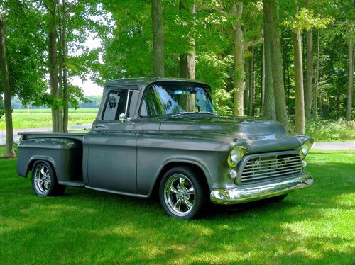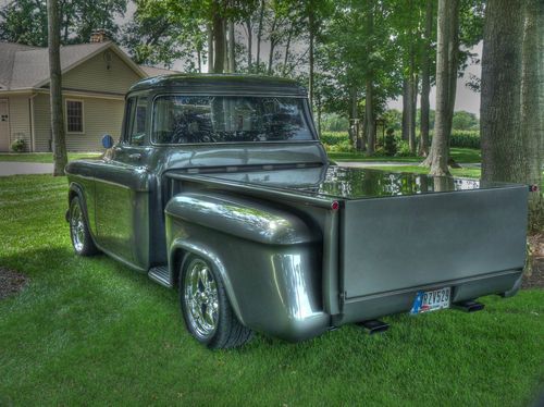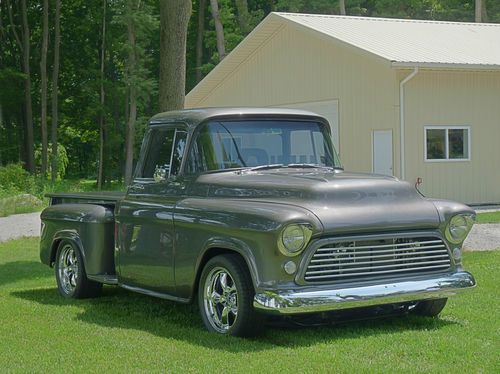 This Is A 1957 Chevy Big Back Window Pickup, Painted Dark Gray Metallic With Seven Color Ghost Flames On The Hood And Front Fenders, It Has A Custom Built Grill With Tri Bar Headlites With Built In LED Turn Signals, The Tail Gate Is Custom Built With Hidden Hinges, The Bed Cover Is Also Custom Built And Is Motorized For Ezzy Access. The Cab And Bed Are Mounted On A 1974 Chevy 1/2 Ton Chassis, With Power Front Disc And Rear Drum Brakes. It Has Power Steering And Has Drop Front Spindals And Rear Leaf Springs. A 12 Bolt Posi With 3:43 Gears. Wheels Are 17 Inch American Classic Chrome Rims, 7 in. Front With 235/45ZR17 and 8 in.Rear With 255/45ZR17 Nitto Extremes. It Has A Full Custom Interior With Auto Meter Gauges, Professionally Done. The Business End Is A 383 Stroker, It Has a 4340 Scat Crank, 4340 Scat Rods, 10-1 Scat pistons, With A Comp Hydraulic Roller Cam And Aluminum Roller Rockers. Edelbrock R.P.M. Performer Aluminum Heads Are On Top. The Whole Assembly Was Balanced And Blue Printed And Is Topped Off With A B&M 144 Blower And Two 40MM Side Draft Mikuni Carbs. The Trans Is A Turbo 350 With A B&M Shift Kit And A 2000 Stall Convertor, No Expense Was Spared On The Truck. It Wins Best Of Show Or 1st Place Almost Every Time Out ! It Is A Real Crowd Pleaser ! Buyer Is Responsible For Pick up. Any Questions Call 574-540-6066