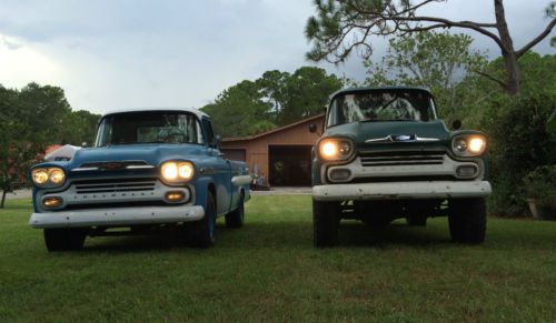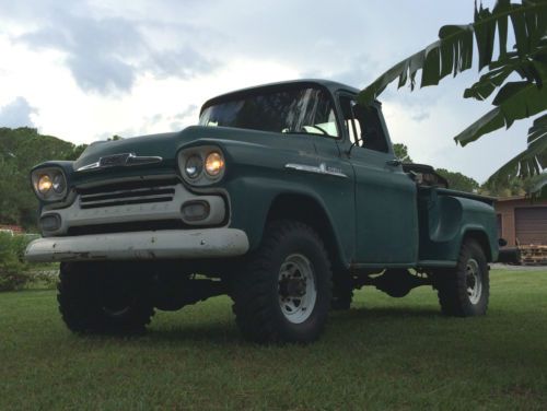 Up for auction is a one family owned 1958 original factory Napco 4x4 Chevrolet Apache 3600 pickup truck from Zephyrhills, FL. The title was last issued 12/26/85 by the original owners son. title is open and signed, its garage kept & only driven around my farm. I have the original 1958 truck owners manual, in it is written key # 8921on inside cover & 4 oil changes on the back cover, 1234,3634,6600 & 9800 miles the 2nd oil change dates 6/13/59 the 3rd oil change was 7/9/59. The speedo reads 30315.1 copy & paste link to watch YouTube video http://youtu.be/pHk9oKfjcaY