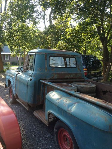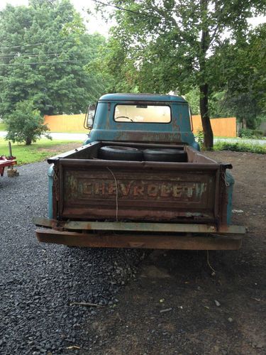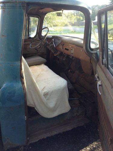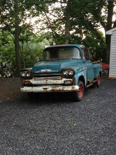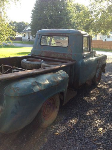 1958 Chevy Apache project truck. Missing the radiator & gas tank, not running probably stuck. I have a nice set of extra doors as well as cab corners. Must be picked up and paid for within 2 weeks after sale.
