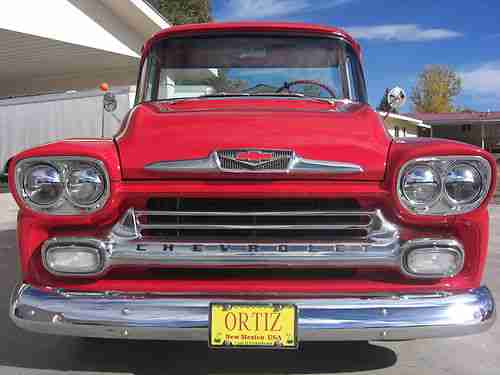 This is with out a doubt one of the finest cameo's available! Truck has less then 1,000 miles on frame off restoration. Truck is lowered by removing three leaf's in both front & rear as well as a fat man drop axel. The 1958 is the most rare of all cameo's. This truck has a OG 283 with a 350 auto trans with after market AC, truck was built to run and it does that very well. This is a New Mexico truck! As nice as the pic's show, the truck is still nicer in person, must see to believe. Any ? call 505-927-3168.