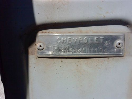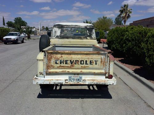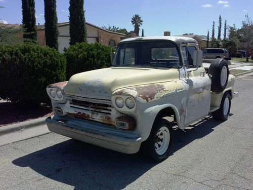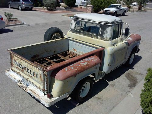 I'M SELLING WITH "NO RESERVE" A 1958 CHEVY APACHE SHORT BED, STEPSIDE PICK UP, WITH BILL OF SALE (VIN:3A58K101194). THE PREVIOUS OWNER RECEIVED A BILL OF SALE WHEN HE PURCHASED THE TRUCK, IN THE YEAR 1986, IN A CAR LOT HERE IN EL PASO, AND ALSO A DEALER'S REASSIGNMENT OF TITLE DATED 1986. THE TRUCK WAS REGISTER IN THE STATE OF CHIIHUAHUA MEXICO AND HAS MEXICAN PAPER WORK . THE TRUCK HAS STRAIGHT 6 CYLINDER STANDARD TRANSMISSION. COLUMN SHIFT, THE MOTOR HAS NOT HAD WORK IN A COUPLE OF YEARS, I DON'T KNOW IF IS MATCHING NUMBERS BUT IT LOOKS TO BE ORIGINAL, THE FRONT WINDSHIELD IS CRACKED AND THE PASSENGER SIDE DOOR GLASS IS ALSO BROKEN, THE REST OF GLASS IS GOOD, THE FLOOR HAS SOME SPOTS OF RUST AND HAS SOME PATCHES, THE SEAT IS MISSING THE FOAM. THE DASH IS MISSING SOME PARTS AND THE STEREO. THE FRONT FENDERS HAVE SOME RUST ON THE BOTTOM.THE CAB CORNERS HAVE SAME PATCHES. THE TRUCK IS MISSING THE FRONT BUMPER, THE BED IS MISSING THE WOOD AND THE BED STRIPS AND THE TIRES ARE USED .