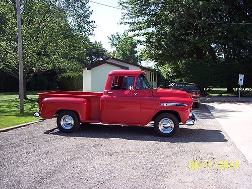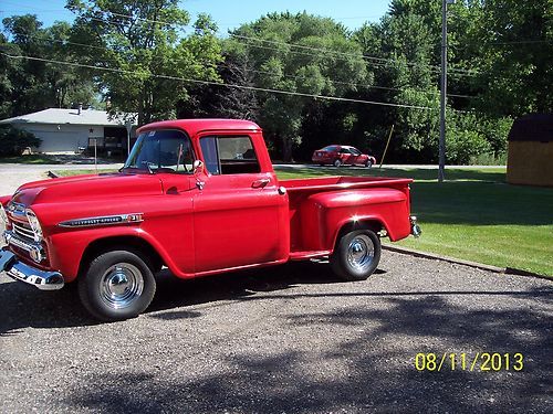 1959 APACHE PICKUP,RED OUTSIDE,RED/GRAY INSIDE,TRUCK FROM NEVADA,350 ENGINE,350TURBO TRANSMISSION,AC,PS,FRONT DISC BRAKES,TILT COLUMN,LOKAR SHIFTER,600 HOLLY,MILD CAM THIS TRUCK IS ALSO FOR SALE LOCAL. WILL STOP AUCTION IF IT SELLS