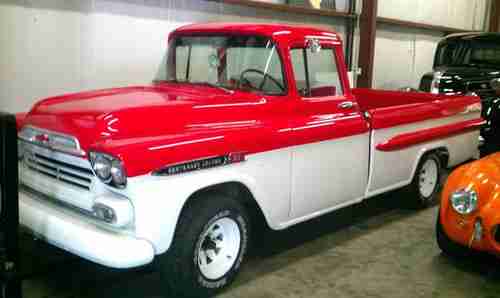 1959 Chevrolet Apache 3200 Long Bed Pick-Up, Looks and runs like a top. Paint job a little over a year old by Custom Coatings of St. Augustine, good tires, white spoke rims, fresh upholstery bench seat. Original 6cyl. engine, 3 speed manual transmission. Diamond-plate on floor of bed, diamond plate steps. Lights, horn, wipers all work, New Exhaust, Battery and Battery Tender /charger. Odometer shows 04886.9 miles.
