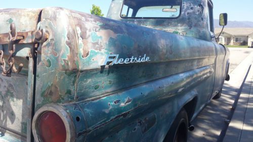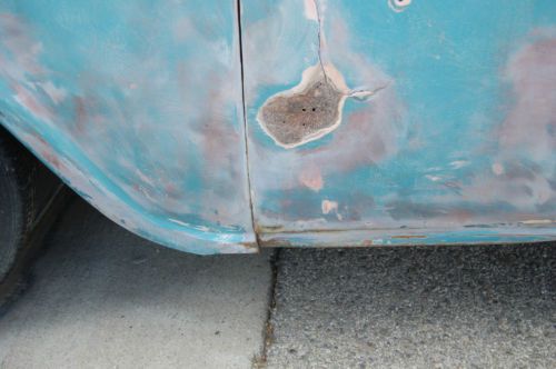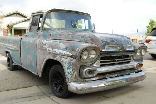 For sale is this 59 Fleetside. Into patina, ratrod or vintage? Here you go. Looking for that black liquid looking paint job, this isnt far away. No major body panels/sheet work needed.1 small hole near bottom of driver door,1 small hole near bottom of passengers door. One 3 inch circle on lower left driver's door. And the sunroof that someone thought was a good idea to install. Maybe so, just not my style. rest of sheetmetal in really solid condition. This a California truck. Couple little patches in the floorboard but very very solid overall, no Fred Flinstone style braking. Footsteps solid, inside rear corners, behind seat, all around gas tank solid. All metal bed rails present & mostly all straight. Even banged up, twisted, rusty, bent, rails are hard to find. Surface rust of course but will try to sand those down & hit with primer before it's sold. It has a mid 70's 307 chevy V8 engine, powerglide automatic transmission, nice sounding dual exhaust, nothing too loud, just nice throaty. It has a Camaro front clip which adds power steering and power brake, disc brakes, better shocks. Mid 90's tilt steering wheel ( will make driving positions more flexible) The front clip was welded onto existing frame, so frame isn't hacked up, no structural integrity lost. Front clip = better steering, braking,smoother ride from mid 70's shocks system versus original 59 suspension. Also, parts are much easier/cheaper to find for mid 70's engine and 80's camaro front clip versus 59 chevy parts. The engine runs strong, kicks right over, sounds really good with the dual exhaust. The shocks need replacing and steering fine tuned. Original turn signals kept & work. Doors seams line up nicely and doors close solid. Emblems,, I have the front side emblems, hood emblem and rear bed " Fleetside " emblems, you will need a new bench seat. It has one there but its beat up . I have 3 extra side quarter windows, the original steering wheel and wipers. And yes, current clear California registration, pink in hand, valid to Jan 2015... I have a perfect ebay rating and plan on keeping it that way so you can bid with confidence. I am selling the truck locally so I reserve the right to end the auction early. If you live in the Los Angeles area, you are more that welcome, and encouraged to come check it out in person. Buyer is responsible for any transportation. You can email me and I can help set something up for you. UPDATE!! I UPDATE! UPDATE!! I had a few requests on info/pics on under carriage. I jacked up the truck and took a bunch of pics. I also took a couple short videos of the engine turning over. I have already sent them to those who requested. If you also want more pics,videos, send me your email and I'll pass them on to you as well. |