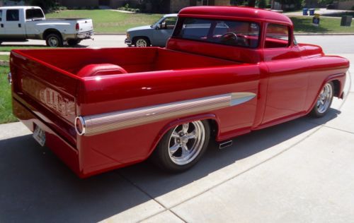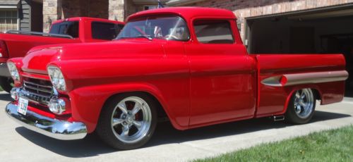 1959 Chevy short wide bed big back window with chop top.I am listing this truck for a good friend of mine. He started building this truck in 2009. He spent 2 1/2 years building this truck. If you was to pay a shop to build this same truck you would spend around a $100,000.00 to $125,000.00 . The only thing he didnt have done on this truck was put Heat and A/C on it as he was only doing car shows with the truck and wanted a clean look under the hood with a smooth firewall. You can add vintage heat and a/c for not allot of money or time. The truck has had less than 1500 miles put on it since built. The only reason the truck is for sale is due to some health issues and he is no longer able to show the truck. The Body of the truck was a nice clean almost rust free truck when he started on it. The top is chopped 4 inches in the back and 5 inches in the front. All custom made glass with over $4000.00 spent on glass.Custom battery box in bed. The side trim was removed and did some custom work as you see in the pics. There is 100's of hours spent in black sanding a prepping this truck for paint not to mention the hours of blocking and sanding for the show buff on the paint. The truck is way over the top . Very nice does not even come close to describing the apperance of this truck. There was over 200 hours spent on the dash and interior paint on the truck. He planned on keeping this truck and spared no expense. Has remote poppers for the doors and has a saftey release in case you lose power. The interior of the truck has late model leather seats withe the driver side power and heated , no carpet , new headliner . Nice kenwood radio. Autometer guages with billet aluminum cluster. Gas gas does not work, needs looked at. There is a couple small spots on interior , one on top of passenger seat and the other on driver door panel where it shuts in jamb. These are the only flaw I seen. I have pictures of both. The Frame and running gear was built by another person and then purchased as a complete rolling unit. *Four link rear suspension with QA-1 coil over shocks *Roll control / rear sway bar *Aluminum fuel tank *4 wheel disc brakes *2 1/2 inch pipe with flowmaster mufflers *17" American Torq Thrust II wheels with Fuzion ZR1 Tires , 255/50/17 and 235/45/17 *Boxed frame with 1976 Nova front suspension , built with all new suspension parts *Ceramic coated headers *Aluminum radiator *Turbo 350 trans with B&M shift kit and small stall , all rebuilt or new *Flaming river stainless steel tilt steering column with custom steering wheel *New mini torque starter with heat shield and wrap. * Rebuilt 350 sbc bored 40 over , 4 bolt main ,Heads ported and polished ,Flat top hypereutectic pistons , roller rockers ,Edelbrock intake and carb ,Moroso high capacity oil pan , Moroso valve covers ,Accel HEI distributor , electric water pump and much more . I am sure there are some fine details I may be misssing but this truck is one of a kind . I have the truck for sale in other places and I may end this auction at anytime !! If you have less than 10 feedback or negative feedback you must contact me before bidding or I will cancel your bid. You can email or call or text me at 919-219-7532 . This truck is located in Nixa Mo. 65714 and can be seen by appointment only. I have almost 70 Pictures and a video at http://s463.photobucket.com/user/yngcarman32/library/1959%20SWB%20chevy%20Chopped For a Video of the truck running and a walk around go to http://s463.photobucket.com/user/yngcarman32/library/1959%20Chevy%20swb%20video I need a $1000.00 deposit in 48 hrs from end of the auction and balance within 7 days from end of the auction and The truck is to be picked up within 10 days from end of the auction unless talked about before end of the auction. Truck sold as is no warranty given or implied. |