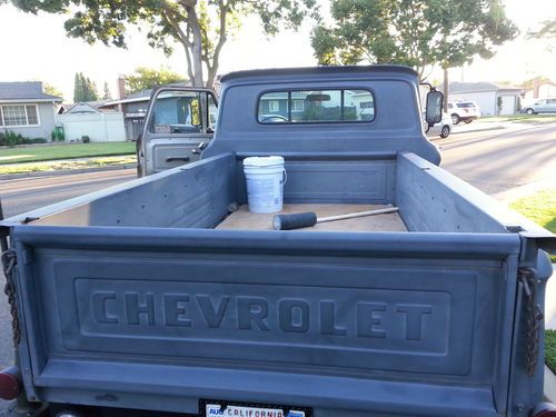 The body of the truck is original steel with few rust spots as seen in photos. The original paint is light blue and under one coat of black primer as seen. There are very few dents or dings. The bed and tailgate are straight with no waves and undented. This longbed is cooler than any Fleet! The original wood is present but could be replaced if you decide to. The steel trim in the bed holding the wood down is straight and in good condition. The hood and doors open and close smoothly, the body lines match up. The door locks are fully functional. Wing windows open and close. All glass is intact but the windshield has two very small chips, no cracks or bulleyes. There appears to be a scratch on the passenger side from the wiper arm with a worn out blade.