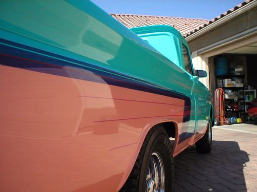 MILD CUSTOM VERY SOLID. CUSTOM TWO TONE PAINT THAT COVERS BODY, BED AND INTERIOR. ENGINE IS A 383 STROKER SMALLBLOCK. 750 CFM HOLLY ON A ELEDBROCK DUAL PLANE MANIFOLD. CAM AND HEI INGINTION, HEADERS AND FLOWMASTERS, SOUNDS AWSOME!