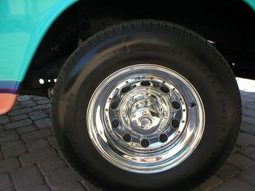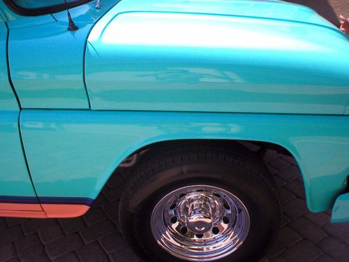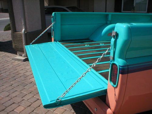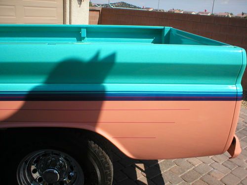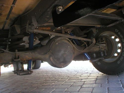 TRANS IS A TURBO 350 WITH SHIFT KIT AND A LOW RPM HIGH STALL CONVERTER. REAR AXLE IS A NON POSI OPEN CARRIER COIL SPRING. NICE CLASS IV HITCH. EXPENSIVE CHROME EIGHT LUG WHEELS AND CAPS NEW CHROME LUG NUTS. ALL 16" TIRES ARE IN NEAR NEW CONDITION. FRONT SUSPENSION, BRAKES, AND FRAME VERY SOLID AND IN GREAT WORKING CONDITION. EIGHT FOOT BOX WITH MAPLE PLAKES,(SEE PICTURES) INTERIOR HAS GREY BUCKETS AND IS FULLY CARPETED(GREY), SHIFTER CONSOLE, NEW GAUGES, TACH,AM/FM/CD,LIGHTER.ALL WINDOWS OPERATE FINE, NEW CHROME WINDOW AND DOOR HANDLES, NEW SEAT BELTS.