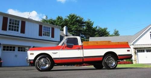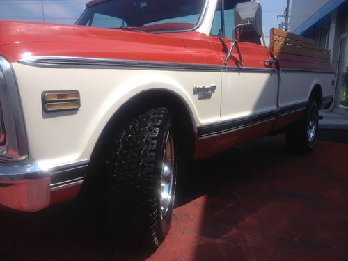 NICE CLEAN 396 CHEVROLET C20 TRUCK CUSTOM CAMPER MODEL. TRUCK STARTS RIGHT UP AND DRIVES NICE. INTERIOR IS CLEAN AND NICE CONDITION. EXTERIOR PAINT LOOKS GOOD, THERE ARE SOME BLEMISHES IN THE PAINT FROM NORMAL YEARS OF STORAGE. CHROME WHEELS SHOW SOME MINOR RUST. TIRES ARE BF GOODRICH AND IN VERY GOOD CONDITION. THE TRUCK HAS SOME NORMAL MINOR RUST SHOWING. I HAVE PICTURED THE FLOOR BOARDS AND THE UNDERCARRIAGE.