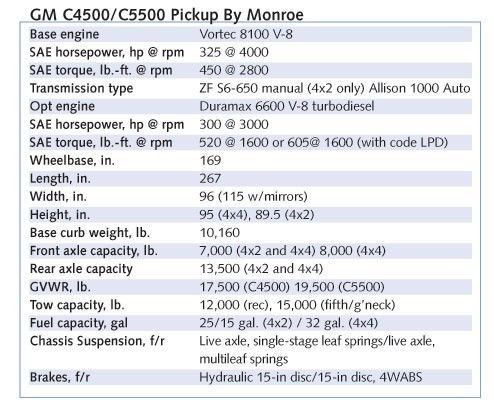 On Jan-28-14 at 15:53:50 PST, seller added the following information: The Head Turner with Hauling Power by Chris Brown - Also by this author SHARING TOOLS | Print Subscribe Share on email Share on facebook Share on twitter Share on linkedin More Sharing Services 0 Can we say "bad ass" in a business-to-business publication? There. We just did. Excuse our French, but the GMC Topkick/Chevy Kodiak pickup by Monroe Truck Equipment is the first real work truck in this industry rag that deserves some enthusiast hyperbole. Build a solid work truck Bill Bolin of Rancho Motors in Victorville, Calif. says four of the nine customers who bought the Monroe conversion last year traded in one-ton duallies. The new toy haulers and horse trailers are heavy, especially those with living quarters. The one tons, while having comparable engine sizes and transmissions as the 4500, don’t have the braking system or the gear ratio to handle the real heavy hauling. Phil Murphy will tell you. Murphy owns an excavation and paving company in Phoenix, Ariz. His smaller 1/2- and one-ton trucks were not doing the job. "In both of them I replaced the rear end, bent and cracked the frames, and went through the brakes, clutch and transmission," he says. "I realized it’s not the truck, it’s what I’m pulling and hauling." Murphy bought himself a 4500 pickup by Monroe and gave it a workout. "I’ve put 9,000 lbs. in the bed while hooked up to a trailer with a forklift on it at 20,000 lbs. and went from Phoenix to Flagstaff," Murphy says. "The truck never broke sweat. I was going up hills at 55 mph." GM added more brawn to the ‘06 models. Four-wheel-drive is now an option, expanding the work possibilities to more rugged environments such as forestry, snowplowing, landscaping, agriculture, tree trimming and utility work. All new 4x4 C4500 and C5500 models feature an 8,000-lb. front axle rating as standard equipment, an additional 1,000 lbs. better than the base axle of the previous year. The ‘06 4x4s also offer an exhaust brake option, which helps the vehicle decelerate without using the service brakes. That’s a huge lifesavings in brake pads and important in preventing overheating during long mountain descents. Add the wow factor The mad scientists at Monroe created the signature eight-foot steel bed with bed panel lines that seamlessly match the contours of the Kodiak/TopKick body. MTE designed a unique subframe for mounting the pickup box to the truck frame, which accommodates a gooseneck or fifth-wheel hitch without extra drilling. In fact, one can be swapped out for the other without invasive surgery. Hitching is easier with the Hitchcam rear-view camera option, mounted directly above the rear receiver, and in-cab flat-screen monitor. The familiar GM 3500 Series interior gets a makeover with brushed aluminum or woodgrain dash trim. The Ultra Seating Package includes leather seats with air suspension and a fold-flat rear seat for the crew cab. See the spec sidebar for more option goodies.