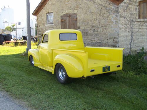 I'VE DECIDED TO SELL MY 1951 VINTAGE CHEVROLET CUSTOM 1/2 TON STREET ROD PICKUP TRUCK. I'VE BOUGHT ANOTHER PROJECT AND THIS ONE NEEDS TO GO. $40,000 INVESTED AT THIS POINT. TRUCK IS COMPLETE EXCEPT FOR THE INTERIOR NEEDS FINISHING. MINT CORVETTE YELLOW PAINT JOB. ALL CHASSIS PARTS ARE ABSOLUTELY BRAND NEW. BRAKES, TIRES, EXHAUST, WHEELS, FAT MAN FRONT SUSPENSION, 9" FORD REAR END, THIS TRUCK WAS DONE RIGHT. 1960'S 300 HORSE 327 WITH LESS THAN 200 MILES. RUNS PERFECT. TURBO 350 TRANSMISSION. FIBERGLASS FENDERS AND RUNNING BOARDS. CUSTOM FABRICATED BOX, SHAVED DOOR HANDLES WITH REMOTE ENTRY, CUSTOM DASH, POWER WINDOWS, AND TILT WHEEL AS PICTURED. NO EXPENSE WAS SPARED WHEN DOING THIS PROJECT. E-MAIL ALL QUESTIONS AND PERSONAL INSPECTIONS ARE ENCOURAGED. $500.00 NON REFUNDABLE PAYPAL DEPOSIT REQUIRED AT THE END OF THE AUCTION. BALANCE TO BE PAID IN BANK WIRE OR CASH. BUYER IS RESPONSIBLE FOR ARRANGING ALL SHIPPING AND DELIVERY. ALL SHIPPING COSTS ARE BUYERS RESPONSIBILITY. IF YOU WOULD LIKE TO TALK TO ME ABOUT THIS TRUCK E-MAIL ME FOR MY PHONE NUMBER. TRUCK IS LOCATED IN MONTICELLO WISCONSIN.