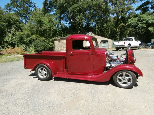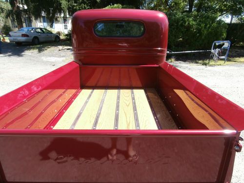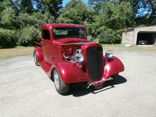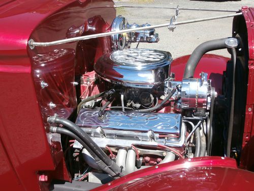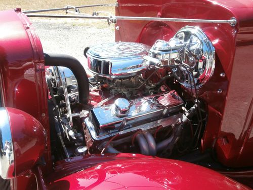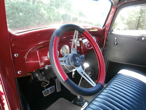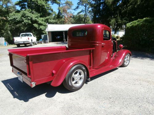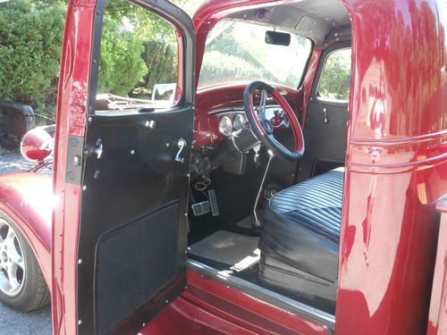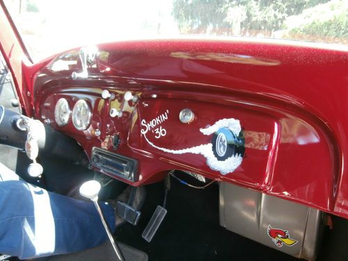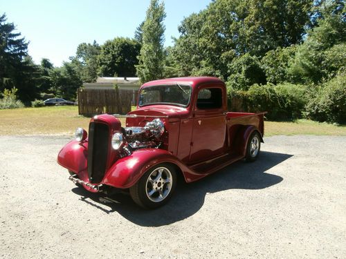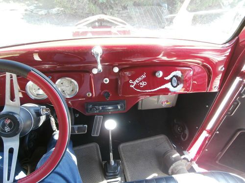 1936 CHEVY PICKUP LOW CAB 350 CHEVY MOTOR WITH NEW AUTOMATIC 700R TRANSMISSION , CHROME ITEMS ON ENGINE , ENGINE PAINTED BODY COLOR. BLACK INTERIOR. POWER BRAKES. POWER STEERING, XJ6 JAG FRONT SUSPENSION WITH A POSI REAR END FROM A CAMARO,WALKER RADIATOR, BRAND NEW DUAL EXHAUST ,ELDERBROCK MUFFLERS ,CRANK OUT WINDSHIELD ALL NEW TINTER GLASS, CD PLAYER ,BAT WING AIR CLEANER DISC BRAKES IN FRONT AND DRUM BRAKES IN THE REAR , ALL NEW WOOD WITH STAINSTEEL TRIM IN BED