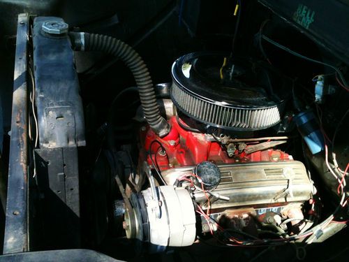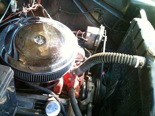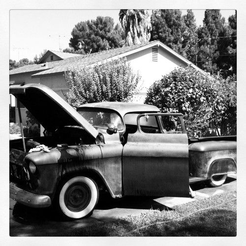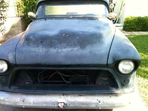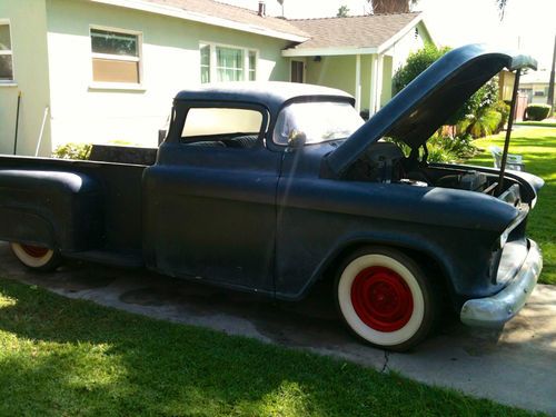 1955 Chevy apache. Engine is a 283 cubic inch V8 with an automatic 3 speed transmission. Truck was a long bed that has been cut down to a short bed. Frame is C-notched in the rear with monoleaf springs. Duel exhaust with flamethrower kit. Roof has been chopped 6 inches. Buick steering column to owed the steering wheel height. Skirts for the rear wheels. New white wall tires. Tags are up to date.