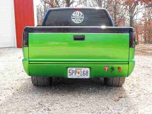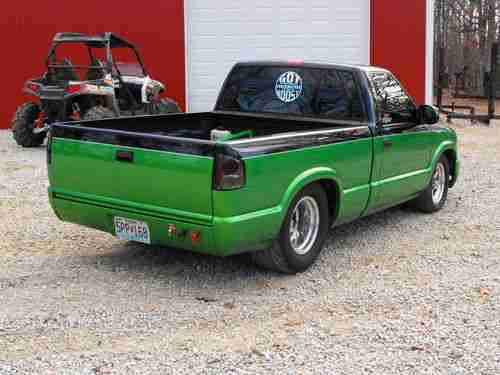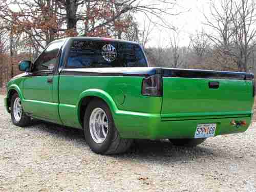 1998 chev s10 pro street /race.Professionally painted black and green 6.0 ltr ls1 engine forged pistons arp bolts througout ported 6.0 heads comp cams blower valve springs, cammotion turbo grind custom cam ,edelbrock intake and fuel rails ,60 lb injectors ,a1000 fuel pump ,aeromotive boost sensative fuel reg. 8 an braded fuel line ,16 gallon aluminum fuel tank ,msd 2-step ,snow performance alcohol injection boost cooler , front mount 2 to 1 intercooler ,twin 62 mm precision turbos v-band style , twin tial wastgates ,manual boost controller , runs on 92 octane fuel ,Turbo 400 trans manual valve body with tci transbrake ,sfi super bellhousing , tci sfi flywheel ,steel driveshaft 1350 series u-joints ,12-bolt narrowed rear end 3.73 gears full spool ,qa1 double adjustable rear coilovers ,ladder bars , hurst shifter , 15x10 billet specialties rear wheels ,352/50r15 MT drag radial rear tires new ,15x4.5 front wheels new tires , cowl hood ,street scene front valance , roll pan ,custom roll bar with removable side bars, aluminum griffin radiator ,160 degree thermostat ,flexalite electric fans dual , power steering ,power brakes .street legal .GM ECM pro tuned and chassis dyno 550 RWHP at 12lbs boost .Runs 7.0 in the 1/8 and 11.0 1/4 at 12psi for more info call 573-776-4108 .Inspection prior to bidding is ok.