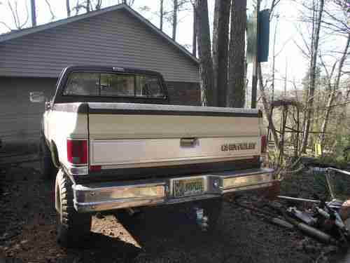 it's a 1984 chevy silverado k10 with a 6 inch BDS full supension lift kit (front and rear leaf springs replaced (no blocks)), it has a completely overhauled 2000 model 5.3 vortec motor with all new sensors, electric fuel pump, new radiator and radiator hoses, less than 3000 miles since overhaul, newly rebuilt TH700R4 transmission with shift kit, a new rebuilt NP208 transfer case. the front and rear ends have been geared with 5.13 gears both have new seals and bearings also the rear has a cromoly pinion yoke. The rear-end has a 12 degree angle to make the drive shaft straight with a custom made rear CV drive shaft from Denny's Driveshafts with 1350 u-joints (the front is factory with 1310 u-joints). Truck has new tie-rod ends, WARN locking hubs, new front wheel bearings and seals, one new rear wheel bearing, new steering box, power steering, front disk brakes with stainless steel braided brake hoses. It has power windows, and power locks but the windows are the only things that work. It has no AC (needs compressor and conversion kit for the 5.3 vortec) but heat works great. the interior is in good shape but needs new door panels, the seats have minor tears on driver side and the carpet is ripped on passenger side, the headliner has no tears, it has a new dash cover, all the gages work. It has dual tanks, both tanks are brand new along with the sending units, new interior tank selector switch. For the outside, the body is in good shape, its 95% rust free with a couple of small dents, the frame is in great shape, it has an all new true dual exhaust with turbo mufflers. The windshield is cracked. It has the rally 4x4 wheels (only 3 trim rings) on it now with Q (36-inch) buckshot mudders with about 50% tread left but I do have a set of black wheels to go along with the truck. I drive this truck to school daily. Will make for a great trail, hunting, or mudding truck. I reserve the right to sell this truck locally.