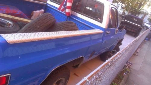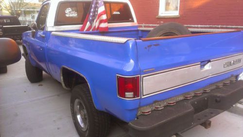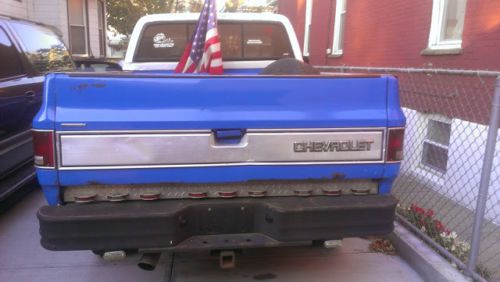 1987 chevy sleet side, this truck has fuel injection. I bought the truck a year ago and has been used as my daily driver. The previous owner had put new brakes, roders, and shocks all the way around. The tires have about 45% tread. the rear chassis is rotted. the reverse lights are on a switch and they are underneith the bumper. This truck does have Wolo Air horns with compressor, a CD player, speakers work great. The flag will not be sold with truck. this truck has cherry bomb glass pack exhaust. It has a custom seat. Also being sold with the truck are the 2 brand new rocker panels. This truck starts right up, four wheel drive works great. bed and tailgate are in good shape, there is assembly for duel tanks, however the passenger tank is not with the truck. There is a switch in the truck to switch between either tank still. AC blows cold. This truck also has a 3 Inch body lift. it is a 3 speed automatic transmission with over drive. This truck is ready to be driven.