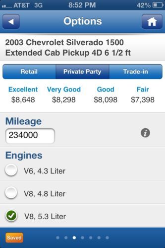 Just bought this truck off of my friend because he needed quick cash for his schooling and a new ride with good gas mileage. So i had the cash and bought it however, it has kind of put me into a slight financial hardship. Anyway, it's a daily driver 2003 Chevrolet Silverado Z71 4x4. First pros: Truck runs and drives good. 233k miles and will go up since I will be driving. Still runs like a dream. Has the 5.3 Vortec. one piece aluminum driveshaft and i just installed new u-joints on it 10-19-13. Has an Edge Evolution CS Performance Programmer all wired in and mounted to the dash with proper mounting kit. Gives you plenty of settings to choose from for specific needs from economy mode to performance mode and towing. Has a K&N cold air intake and i believe a flowmaster muffler. Bose stereo with aftermarket Sony deck, sounds great. No tears in the seat or carpet. All electrical works. 33" tires are probably about 40-50 percent I would guess. These are mounted on some nice 17" black 8-hole aluminum wheels. Bed has a spray in bed liner that is color matched and also has an additional rubber bed mat. also has a factory tow package with the wiring for four pin or newer round. For the cons. The 4x4 isn't engaging. Shop told me its an encoder motor. It's a 250 part from autozone. Just dont have the money at the moment but, i may replace it soon to make the truck more appealing. Also the windshield has a crack. Not sure on the price of a new windshield. my friend that i bought the truck from was going to attempt to put a "prerunner" bumper on the front but, never got around to it. hence there is no front bumper mounted, i have the bumper however he lost the plastics for the front bumper. i found a complete front bumper in great condition for $150 so if the buyer is interested i can give them the info for it. (Picture of KBB enclosed. I'm mainly interested in selling to get my money back to make the wife happy. Ha however, I may be interested in trade or partial trade. Thank you. Call or text me at 6613oo1378. If I don't answer leave a message. I reserve the right to terminate this auction early if i sell since i have it for sale locally as well.