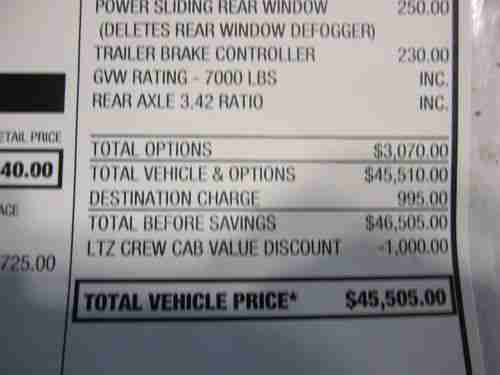 THIS BEING SO NEW, THERE IS NOT MUCH TO SAY ABOUT THE INTERIOR EXCEPT PERFECT, STILL SMELLS NEW. BEING AN LTZ IT HAS ALMOST EVERY OPTION AVAILABLE, HEATED SEATS, POWER SLIDING REAR WINDOW, EASY LOAD TAILGATE, ETC. THE ONLY ONES IT DIDN'T HAVE WERE THE POWER SUNROOF, FACTORY NAVIGATION, AND REAR ENTERTAINMENT. I WANTED IT THIS EXACT WAY, I HATE SUNROOFS DUE TO LEAKS, I'VE HAD SEVERAL NEW GM VEHICLES WITH NAVIGATION AND ALWAYS HAD SOME KIND OF PROBLEM, I AM PRETTY MUCH THE ONLY ONE IN THE TRUCK SO REAR ENTERTAINMENT WOULD BE A WASTE. I DID WANT SOME FORM OF COOL SCREEN NAVIGATION COMBO SO I HAD BEST BUY INSTALL THE NEW PIONEER SET UP. NO CUTTING OR DRILLING, WENT RIGHT IN, SIRIUS RADIO, IPOD, ALL THE GOODIES AND TWICE AS MANY OPTIONS AS THE FACTORY UNIT.