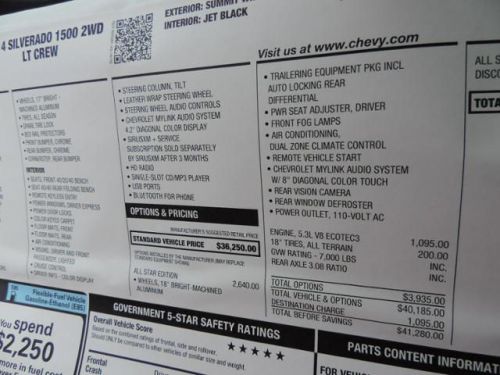 Head Airbag, Aluminum Wheels. EPA 23 MPG Hwy/16 MPG City! LT trim, Summit White exterior and Cloth, Jet Black, Interior Trim interior CLICK NOW!======KEY FEATURES INCLUDE: Satellite Radio, CD Player, Onboard Communications System Privacy Glass, Keyless Entry, Steering Wheel Controls, Heated Mirrors, Electronic Stability Control. ======OPTION PACKAGES: ALL STAR EDITION includes (AG1) driver 10-way power seat adjuster with (AZ3) bench seat only, (CJ2) dual-zone climate control, (BTV) Remote Vehicle Starter system, (IO5) MyLink 8 Diagonal Color Touch Screen audio system, (UVC) Rear Vision Camera, (C49) rear-window defogger and (KI4) 110-volt power outlet and 18 aluminum wheels (Includes (Z82) Trailering Package, (G80) locking differential, (PZX) 18 x 8.5 aluminum wheels and (T3U) fog lamps. ENGINE, 5.3L FLEXFUEL ECOTEC3 V8 WITH ACTIVE FUEL MANAGEMENT, DIRECT INJECTION AND VARIABLE VALVE TIMING includes aluminum block construction with Flex Fuel capability, capable of running on unleaded or up to 85% ethanol (355 hp [265 kW] @ 5600 rpm, 383 lb-ft of torque [518 Nm] @ 4100 rpm; more than 300 lb-ft of torque from 2000 to 5600 rpm), DIFFERENTIAL, HEAVY-DUTY LOCKING REAR, TRAILERING PACKAGE includes trailer hitch, 7-pin and 4-pin connectors, SEAT ADJUSTER, DRIVER 10-WAY POWER, REAR VISION CAMERA WITH DYNAMIC GUIDE LINES, REMOTE VEHICLE STARTER SYSTEM, 1LT PREFERRED EQUIPMENT GROUP includes standard equipment, SEATS, FRONT 40/20/40 SPLIT-BENCH, 3-PASSENGER, AVAILABLE IN CLOTH OR LEATHER includes driver and front passenger recline with outboard head restraints and center fold-down armrest with storage. Also includes manually adjustable driver lumbar, lockable storage compartment in seat cushion Pricing analysis performed on 6/7/2014. Horsepower calculations based on trim engine configuration. Fuel economy calculations based on original manufacturer data for trim engine configuration. Please confirm the accuracy of the included equipment by calling us prior to purchase. Orr Chevrolet in Texarkana is your Chevy Headquarters!*These prices include all applicable rebates through GM for Zip Code 75503. Although rebates are pretty standard everywhere, your location will ultimately determine which incentives you qualify for. We do not include accessories or dealer installed options in our pricing. Please call to confirm trim, mileage, options, and to ensure availability