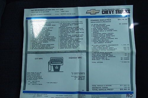 This is a 2001 Chevrolet Siverado 2500 LS Extended cab 4X4. With respect to the age and mileage of this vehicle - Interior is good, paint shines, the truck is in good running order. Please note one exception, there is a leaking transfer case that we did not repair (properly). I have attached photos to show the leak and we have covered the leak with sealer so it holds oil and can be driven. Rear case half should be replaced to fix properly. Photos should show the leak before the sealer was applied. I would ask that anyone not familiar with this fairly common issue phone our mechanics or your mechanic for details. We have elected to sell as is and not repair this truck.