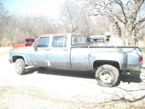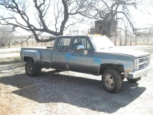 I have an 1986 chevy 3500 crew cab 4x4 good ol truck. truck has 86 k on it not sure if thats original miles, engine is all original everything is there just like factory,interior is just like new back seat is perfect dash has no cracks in it all the windows work i replaced all the window motors awhile back.It has a 205 transfer case i just had it rebuilt that was about 700 bucks but worth it.Truck runs and drives great 4 wheel drive works awesome this truck will go anywhere. It has waren lock outs on it. I Think im the third owner. She has a little rust in the usual places but not bad for the year, also a few dents and dings good solid truckAsking 6,500 i have about 7,000 invested.BUYER RESPONSIBLE FOR ALL SHIPPING FEES! My number is (580) 765-7862 Thanks!