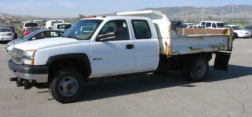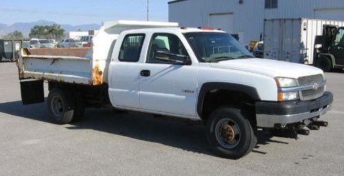 2003 CHEVROLET SILVERADO 3500 EXTENDED CAB 4X4 CHASSIS -- UNLEADED -- WHITE -- AVG 8 MPG -- 80,510 MILES ===== LEFT MIRROR CRACKED - DINGS - SCRAPES - UPHOLSTERY & FLOOR STAINS. COMES WITH A 2003 KNAPHEIDE NS-9 DUMP BODY - RUST ON BODY .THIS VEHICLE STARTS & RUNS. PLEASE CONTACT JENNIFER HARDY 801-538-3082.