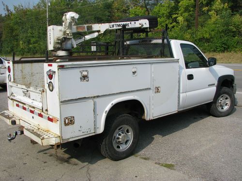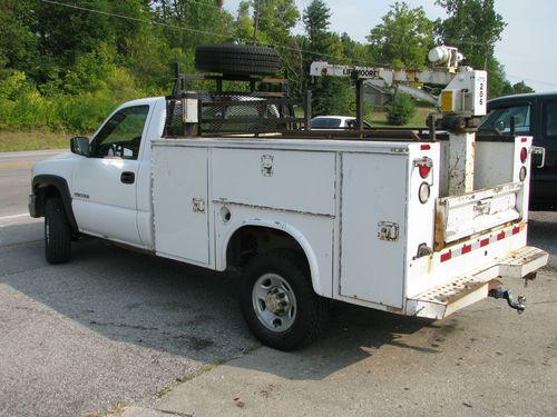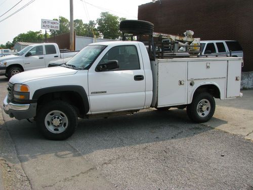 FULLY FUNCTIONAL READY TO WORK UTILITY BED CRANE TRUCK, POWERED BY THE 8.1 VORTEC TEAMED UP WITH HEAVY DUTY ALLISON TRANNY FOR ALL YOUR TOWING NEEDS. TRUCK STARTS RUNS AND DRIVES VERY WELL MECHANICALLY NO ISSUES. SINGLE FLEET OWNED (AUTO CHECK READS 3 OWNERS DUE TO LEASE BEING RENEWED 3 TIMES) UNIT THAT HAS BEEN TAKEN CARE OF VERY WELL. INTERIOR IS SUPER CLEAN NO DETAIL WAS NECESSARY ON THIS TRUCK ONCE IT ARRIVED TO OUR LOT, PREVIOUS DRIVER TOOK EXCELLENT CARE IN CLEANING AND MAINTAINING INTERIOR CONDITION. HAS FLOOR SHIFT 4WD IN GREAT WORKING CONDITION, AC BLOWS ICE COLD, CLOTH SEATS WITH FOLD DOWN/OPENING CONSOLE, AND RUBBER FLOOR MAT TYPE FLOOR FOR EASY CLEAN. EXTERIOR OF TRUCK CLEANS UP NICE. BED IS SOLID ALL DOORS OPEN AND CLOSE CORRECTLY, LOCKS FUNCTION WITH KEY. CRANE IS 2000LB IN WORKING ORDER WITH CONTROL. POWER TO CRANE CAN BE TURNED OFF FROM SWITCH INSIDE CAB OF TRUCK. TRUCK IS HAS LOWER MILES FOR AN 05 WORK TRUCK AND RUNS OUT VERY WELL, NO CHECK ENGINE OR WARNING LIGHTS ON DASH. HAS BRAND NEW TIRES LESS THAN 50 MILES. IF YOU HAVE BEEN IN THE MARKET FOR A HEAVY DUTY 4X4 CRANE WORK TRUCK LOOK NO FURTHER YOU WILL NOT BEAT THIS DEAL! CALL 859-588-4994