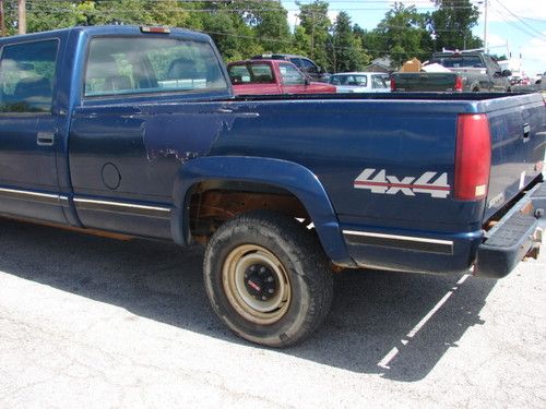 OK GUYS HERE IS A TOUGH FIND! YOU HAVE TO FIND'EM TO BUY'EM AND I DO NOT KNOW WHERE YOU WILL FIND ONE COMPARABLE TO THIS TRUCK. A 1996 GMC SIERRA SL CREW CAB 4X4 TRUCK 3500HD SERIES SINGLE REAR WHEELS EQUIPPED WITH THE 6.5 TURBO DIESEL ENGINE AND AUTOMATIC TRANSMISSION. THIS TRUCK IS A ONE OWNER LOW MILE UNIT ONLY 109810 FROM AN AGRICULTURAL DISTRICT IN THE STATE OF GEORGIA. A TRUE SOUTHERN TRUCK WITH NO RUST OR BLISTERS ON THE CAB CORNERS,WHEEL WELLS, OR ROCKERS. THERE IS NORMAL RUST ETCHING ON THE FRAME RAILS AND UNPAINTED METAL PARTS. ABSOLUTLEY NO ROT OR RUST ISSUE CONCERNS . THE AREAS ON THE BODY BOTTOM EDGE BEHIND BOTH FRONT WHEELS HAS PAINT LOSS FROM FINE GRAVEL/SAND . THE BODY PANELS HAVE NORMAL SMALL DINGS/DENTS SCRATHES AND SO FORTH. THE PAINT IS FADED AND SHOWS CLEAR COAT LOSS AND FLAKE. THE CAB INTERIOR IS AS NICE AS ANY YOU WILL SEE FOR A WORK TRUCK. SEATS HAVE NO DAMAGE. GOOD RUBBER FLOOR MAT THAT HAS A WEAR HOLE IN THE CENTER OF THE DRIVERS FOOT REST AREA. ALL DOOR HANDLES INTACT AND UNDAMAGED. ALL GLASS INTACT AND UNDAMAGED. DASH COVER HAS CRACK ABOVE AC/HEAT VENT NEAR DRIVERS DOOR. A COUPLE OF THE AC/HEAT VENTS DO HAVE DAMAGE. TIRES ARE FAIR CONDITION. THE TRUCK RUNS EXCELLENT AND RUNS LIKE A TRUCK WITH ONLY 109000 MILES SHOULD RUN. THE GLOW PLUGS CYCLE AND WITH THE TURN OF THE KEY THE NEW INJECTION PUMP FIRES THE ENGINE RIGHT UP WITH NO WHITE SMOKE . THE TRUCK RUNS EXCELLENT AT HIGHWAY SPEEDS AND THE TRANSMISSION SHIFTS PROPERLY IN ALL GEARS. THE TRANSFER CASE IS FULLY FUNCTIONAL IN BOTH HIGH AND LOW GEARS. THE BED INTERIOR SHOWS PAINT LOSS, SCRATCHES AND NORMAL USE WEAR FOR AGE. THE TRUCK COMES WITH THE ORIGINAL MANUALS STILL IN VINYL JACKET. OVERALL THIS IS AN EXCELLENT OPPURTUNITY TO PURCHASE A DIESEL TRUCK THAT HAS A LOT OF LIFE LEFT. YOU CAN SHOP OUR SPECIAL INTERNET PRICE ANY WHERE IN THE UNITED STATES AND IF YOU DO GET LUCKY AND FIND ONE SIMILAR IN MILES AND CONDITION YOU WILL HAVE TO PAY THOUSANDS MORE THEN WHAT YOU CAN BUY THIS ONE FOR.!!! CALL 859-588-1485 FOR QUESTIONS.
