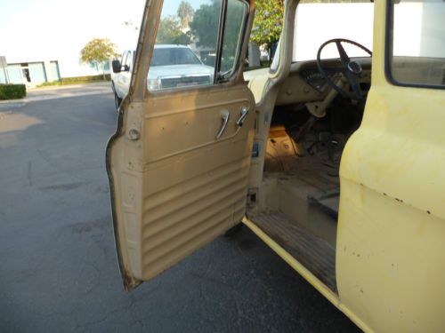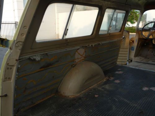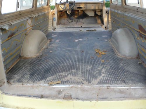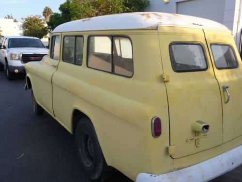 1956 Chevy Suburban Carryall, 1/2 ton. Very clean with a solid body, 95% rust free. All doors open and shut properly. Panels, fenders and doors all align properly as well. Front floor is very solid with just one small rust spot (see picture), also in amazing condition is the rear original black linoleum mat area with no holes drilled in it. The roof and the drip rail around the top are all very nice, as well. All window frames are nice and solid. It also has all rear window handles and locking tabs. NO ENGINE, TRANSMISSION OR SEATS. This is too nice of a vehicle to part out, but would be a nice restoration candidate. It comes with a clear Nevada title. Vehicle is being SOLD AS IS. Buyer is responsible for all transportation fees and arrangements. Any questions or for further information, please contact me at (805) 377-9065. SORRY NO TRADES.