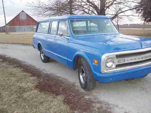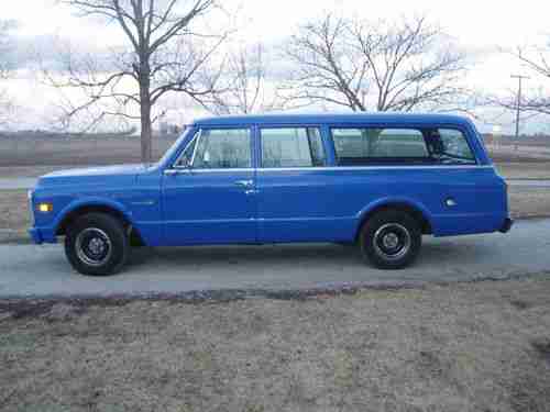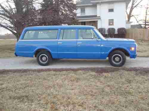 Up for Auction: 1971 Chevrolet Suburban 1/2 ton V8 automatic. Body taken off frame, stripped to bare metal and painted approximately 8 years ago with epoxy primer and urethane paint. No salt since new paint. Has been a daily driver when the roads are salt free. Paint still looks good there are some bubbles here and there. Drive very good. New weatherstripping, rubber flooring, upholstery, headliner, dash pad, sunvisors, arm rests. Power steering works fine, but pump does whine. Has good Y pipe and glass packs, but exhaust needs finished.