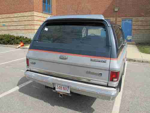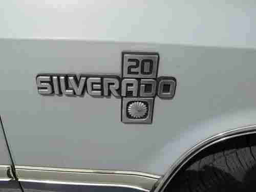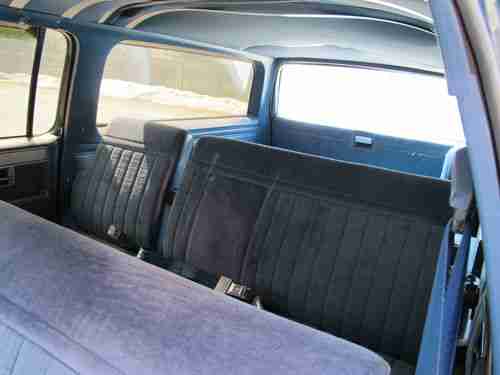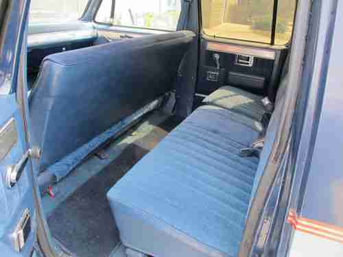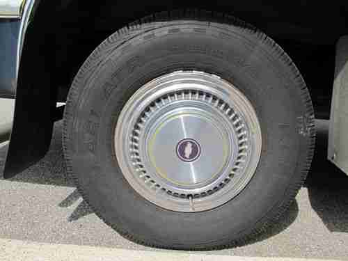 Body: Body is in really good shape, but not car show perfect. Blue original paint, looks almost like new, the previous owner garaged this truck and swore by waxing it regularly. The large grey stripe down the sides has faded a little, probably a different type of paint than the blue. Chrome looks great, still has great shine. Cool retro hubs look great. Diamond plate running boards in great condition. The frame and undercarriage had a Rusty Jones undercoating treatment when purchased in 1984, which is why it is still in such great condition. Full disclosure: There are a few small spots of rust. On the passenger side, inside the front wheel well there is a small rust hole (2" diameter hole), this hole is only through the wheel well wall, and does not go into the body (see attached photo). On the bottom interior edge of 3 out of the 4 doors there were some slight rust bubbles (have to open the doors and get down on your knees to see this) and the interior bottom edge of the tailgate had some rust bubbles and splitting as well (only seen when tailgate is opened). So the good news is that none of this is seen from the exterior, when the doors are closed, and can only be seen when opened and looking for it. I treated all these rust issues mentioned above by: Opening any bubbles with a screwdriver, drying area thoroughly with a hair drier, applied several coats of Rust Bullett (a powerful rust stopper/inhibitor), and applied several coats of matching blue touch up paint. Also on the driver side in the grey paint area there is a 2' long scratch and two 3" diameter areas where the grey paint has flaked off, not sure why. It is not rusting in these areas. See the photo showing this. I left these untouched because I was planning on having this area repainted by a body shop, but never got around to it. The silver plastic trim has also delaminated in a few spots but is still secure, only looks dirty because of it. Bottomline: body is in really good condition considering the vintage of the car, but it is clearly not ready for a Barrett-Jackson auction. But it would not take much to take care of these minor cosmetic issues.