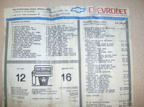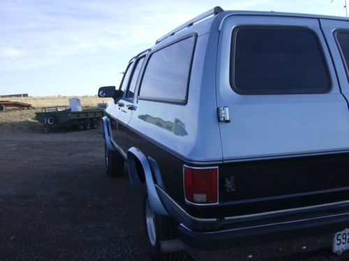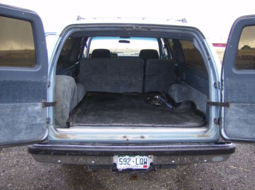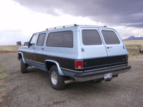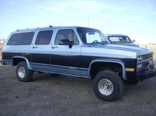 very clean 1991 Chevrolet suburban. 4 wheel drive works great. New tires with about 200 miles on them. Brakes are at about 70% rear and 60% on front. Front and rear a/c both work. Transmission shifts great. Mechanically a very sound vehicle. The third row seat is gone. Interior is in great shape. Headliner is still all up there but has come unglued in spots. Power windows and door locks all work fine. Needs a door handle for the rear barn door. The knob has come out of it, still have the knob and it can still be used to open it. There is a little rust spot on the passengers side above the long back window. Winch works on the front, it is a 6000 pound. Glass is all good. The engine runs awesome, good old tbi 350. Has 3.42 gears and a limited slip rearend. Paint is not perfect on it but it sure gets a lot of compliments. I have the original window sticker also. If you bid on it and get it and want to fly out and get it I can pick you up at the airport in Durango Colorado and you can drive it to New York if you want. I am an ASE master tech and have fully inspected this guy and would not be afraid to drive it anywhere. I have tried to describe as best I can the condition of the burb. I am not out to deceive anybody. I have had people tell me how nice something is and be very disappointed when I go to get it. Please feel free to ask any questions you have about it. Thanks, Joe.