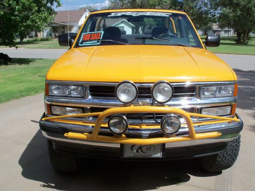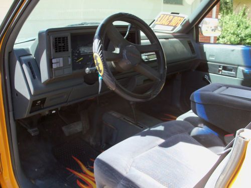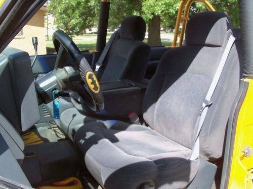Truck is in excellent condition no rust or dents what so ever. It has cold ac ps pb heater alpine stereo new 315x17" bfg tires on hummer wheels tires are new. Has 3" Body lift with new fender flairs plug in for trailer and receiver hitch. Truck has newer suburban gray cloth seats with 3rd seat no rips tears or stains. Truck has rubber floor mats no carpet. Front door windows are in place and work as should, back door windows have been removed. This truck has had the top removed and a very nice job was done to mount the roll cage all gaps have been filled and painted to match the yellow color. New bikini top just installed and looks great. Truck is powered by 350 cu. in. fuel injected engine with auto. trans. Truck has 4 off road lights mounted on custom front bumper. Windshield is perfect, odometer quit at 73000 miles so miles are unknown. Cruise does not work either. I reserve the right to end auction early because truck is for sale locally. Please call 620 617 4700 for questions. Jerry FYI this truck is not a piece of junk that is why I bought it. You can fly in and drive this anywhere, it runs and drives down the highway at 70mph with no problems at all. Thank you and good luck.