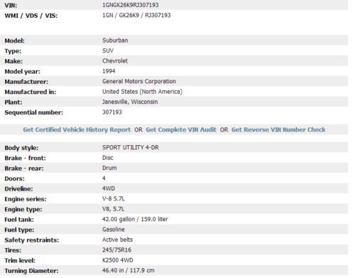 94 chevrolet k2500 4x4 suburban silverado sport utility 4-door 6.5l turbo diesel