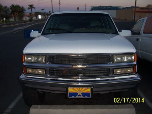 454 cu in V8 Engine with HD 4L60 Tranny. 106,816.00 Miles. Runs great. Always used Amsoil synthetic oils. ABS module not working, brakes work fine but no anti lock. Front drivers side quarter panel has some paint flaking off. White color with custom pin stripes. Beige Leather interior. 3 row seating. Lift Kit with Custom 8 lug wheels & like new oversize tires. 10mpg town - 12-15mpg Hwy. K&N Air filter charger Kit. Call John at (928) 486- two five zero two. Vehicle is located in lake Havasu City, AZ |
