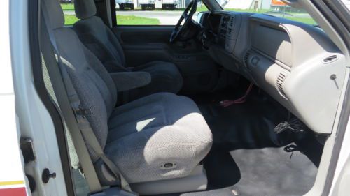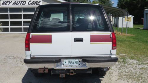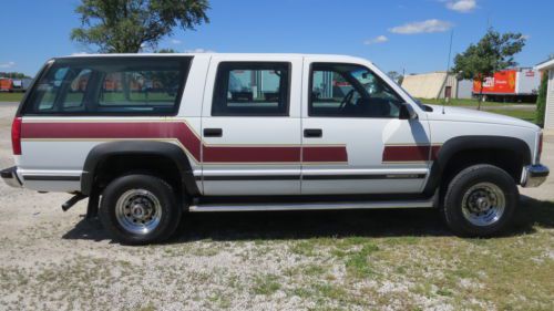 1997 Suburban 4WD 2500 for sale. White exterior with decals. Gray cloth interior seats. 4 speed automatic transmission w/ overdrive. Some rusted areas as shown on photos. 2 bucket front seats and rear bench seat - no 3rd row seating. A complete extra set of the stock, steel wheels included (in boxes in back of vehicle in photo). Steering wheel is worn and has a small chunk out of it on backside. If interested, please bid, this auction will not end early. Any questions, please call Larry at 217-384-2379. No emails please.