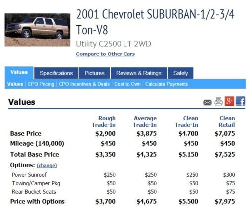 2001 Black Suburban, very dependable. I am the second owner and have had the vehicle since 2004. I have all receipts and maintenance records for the truck. Just had the oil changed and tune up. I have 4 vehicles and not enough space so this one needs to go to make some room in my driveway.