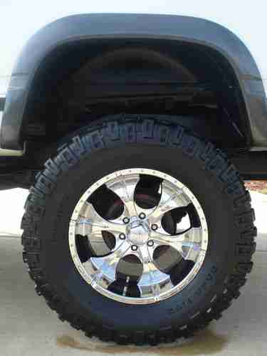 The truck sits on beautiful Mickey Thompson Baja 38 x 15.5 R20LT tires and stunning 20" chrome wheels. I get compliments on the wheels everytime I drive the truck, they really set the whole truck off and shine like you wouldnt believe.