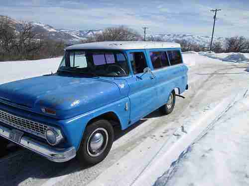 1963 Chevrolet Suburban C10. This is a running, driving, 1963 Chevrolet Suburban. It has the large six cylinder engine with a four speed transmission. I have a clear Original Utah Title in my name. The engine sounds good, the four speed transmission shifts properly, and the brakes work as they should. The floors are dry and solid, but there is minor rust in the driver's side door. This is a very original 1963 Chevrolet Suburban that can be used as a daily driver. The truck was previously owned by a Utah rancher and the after-market seat covers are cloth fabric in a cowhide pattern. The original owner's manual is in the glovebox. The reserve is low. As you can see from the photos, I live in the mountains and this two wheel drive truck is not real good on snow covered roads.