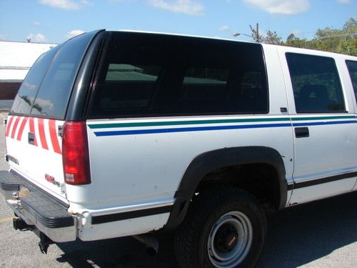 PERFECT TRUCK FOR UTILITY WORK OR SPORTSMAN. THIS 1994 GMC SUBURBAN 4X4 2500 WORK SERIES IS IN EXCELLENT MECHANICAL CONDITION. THE 5.7 V8 ENGINE STARTS UP EASY AND RUNS OUT VERY STRONG. THE AUTOMATIC TRANSMISSION SHIFTS SMOOTHLY AT TAKE OFF AND THRU ALL OTHER GEARS. THE 4X4 TRANSFER CASE IS IN GOOD WORKING ORDER AND EASY TO USE. THE TRUCK HAS A SOLID BODY AND FRAME. THERE IS SOME RUST ON THE LOWER BODY FENDERS ISOLATED NEAR THE WHEEL FLARES. THE UNDER FRAME HAS NO ROT OR DAMAGE. THE BODY PANELS HAVE NORMAL WORK USE COSMETICS THAT INCLUDE DINGS/DENTS SCRATCHES CHIPS AND SO FORTH. THE INTERIOR SEATS ARE EXCELLENT NO WEAR OR DAMAGE TEARS. THE FLOOR COVERING IS RUBBER MAT AND THERE ARE A FEW WEAR HOLES IN THE MAT. THE AREA BEHIND THE SEAT HAS WEAR AND IS MISSING A SECTION OF THE RUBBER MAT. ALL DOOR HANDLES FUNCTION IN THE OPEN AND CLOSE POSITIONS. THE WINDOWS ARE MANUAL TYPE SO NO WORRIES ABOUT BAD MOTORS OR STUCK WINDOWS. THE ENGINE COMPARTMENT IS FAIRLY CLEAN THERE ARE FLUID DRIPS ON DRY PAVEMENT. THE TIRES ARE MATCHED PAIRS AND BOTH ARE CLOSE TO NEW WITH DEEP TREAD. SO IF YOU ARE IN THE MARKET FOR A SPORTSMAN TRUCK OR IF YOU NEED A TRUCK FOR THE BUSINESS THIS ONE WILL SERVE YOU WELL AND OUR SPECIAL INTERNET PRICE IS VERY AFFORDABLE EVEN FOR THE BUDGET MINDED BUYER. CALL 859-588-1485 FOR QUESTIONS.