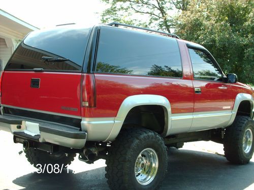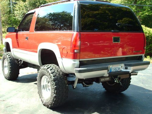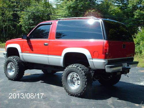 1995 CHEVY TAHOE LT 4X4 ,ONE OWNER,,PREVIOUS TITLE STATE IS NEVADA, TRUCK IS RUST FREE,,ROT FREE,,CLEAN CLEAN,,LOADED,, PRO COMP 7" LIFT,,235X14.5X16 TIRES,,P/S,,P/B,,A/C,,P/W,,AUTO,,MOTOR TOTALLY RE-DONE @ 100K,,TRANS DONE 1 YEAR AGO,,MILEAGE 149K,,CLEAR COAT WAS PEELING SOOOOOO, PAINT IS BRAND NEW. YOU'LL HAVE TO LOOK FAR TO FIND ONE THIS CLEAN AND TALL,,DRIVES AND HANDLES REAL NICE,,PLEASE CALL MY CELL 978-894-3314 AND OR E-MAIL ME MORE ANY QUESTIONS AND OR CONCERNS BEFORE YOU BID. CELL PHONE SHUTS OFF @ 7PM,,,SOOOOO ,,DAYS ONLY PLEASE,,THX FOR LOOKING,,,,,,SKIP