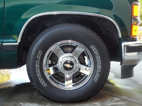 This is an original unmolested,never wrecked, loaded rare, two door, two wheel drive Tahoe. It was purchased new in Southern California. I purchased from the original owner a few years ago. He changed the title into only his name after divorce which is why it shows two owners. It was lowered by "de-arching" the rear leaf springs and bell-tech dropped spindles. New gas shocks make it ride tight and new. These rare 16" Tahoe Limited Rims were found new in the box in chrome. The 80,000 mile Michelin tires are the best ride you can get and have 1400 miles on them..Magna Flow exhaust and stainless tip with K & N filter in the factory air box helps you to get 18+ mpg at 65 mph!!The carpet is nearly flawless and so is the leather..A/C is ice-cold and leaks are nowhere to be found. No rattles..Doors close nice..Never abused by 60+ year old owner..or me..Only 3 or 4 dings in the wheel opening moldings...Always garaged since new ready to drive anywhere. Has factory tow package. In fact, I had to get my bolt cutters out to remove the Chevy Bow tie insert that was locked in at original purchase. I have all original owner's paperwork. When I bought it I replaced: plug wires, plugs, cap, rotor, fuel filter all which appered to be original to the car. Water pump was done as well...Everything works and its ready to cruise anywhere...Winning bidder can save $1500.00 by allowing me to keep the wheels. I have an original set of these same wheels in factory anodized silver with used tires as a substitute...