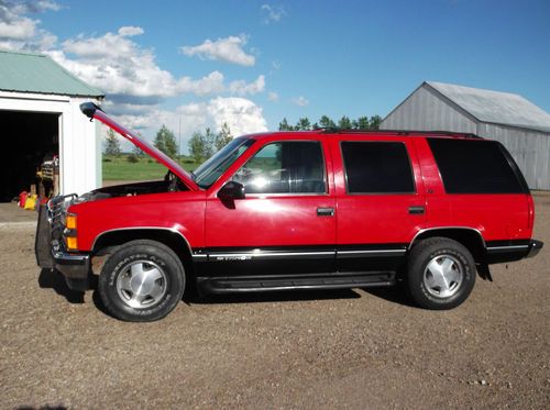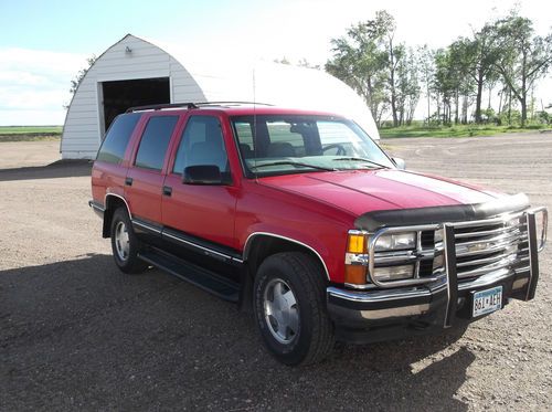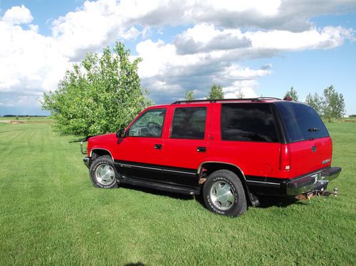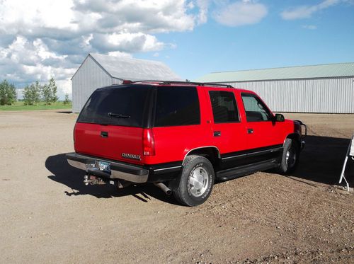 Super clean tahoe up for sale. No known issues. Everything works as it should. Paint shines like new. Transmission has bright red oil and shifts like a new one. Engine runs smooth and quiet as it should. Fresh oil change July 1. Tires are approximately 50%. Vehicle can be driven anywhere. Road ready. A/C blows ice cold. If I can't get what I feel the vehicle is worth I will gladly park it in the shed for winter and drive it again next spring and summer. I will be traveling to Missouri the end of October and arrangements can be made to meet someone if need be. I am in no hurry to sell my red baby. Any questions feel free to ask. Vehicle can be made available to see or test drive any time. Drives and rides like a Cadillac and pulls like a pickup...must be a Tahoe huh?