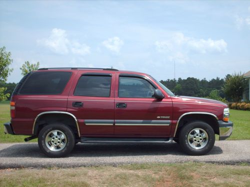 UP FOR AUCTION IS A 2003 CHEVROLET TAHOE. THIS VEHICLE IS IN GOOD OVERALL CONDITION. IT HAS A FEW LIGHT SCRATCHES IN THE PAINT AND THE DRIVERS SEAT AND ARMREST HAS TEARS AND THE STEREO BUTTONS HAVE WEAR AND THE SHIFT INDICATOR DOESNT LIGHT UO IN THE DASH ANYMORE. OTHER THAN THAT THIS IS A WELL MANTAINED NICE VEHICLE. IT HAS NEW BRAKES ALL THE WAY AROUND , BOTH FRONT WHEEL BEARINGS HAVE BEEN REPLACED , THE A/C COMPRESSOR HAS BEEN REPLACED , THE TRANSMISSION WAS REBUILT ABOUT 20K MILES AGO AND THE OIL HAS BEEN CHANGED EVERY 3K MILES BY ME SINCE WE PURCHASED IT IN 2004. THE VEHICLE DRIVES AND RUNS GREAT. IT HAS NO LEAKS AND DOESNT BURN ANY OIL BETWEEN CHANGES.THE A/C BLOWS COLD AND HAS FRONT AND REAR CONTROLS.THE TIRES STILL HAVE A FEW MILES LEFT ON THEM.IT HAS A POWER DRIVERS SEAT AND ALL OTHER POWER OPTIONS ON THE LS MODEL INCLUDING LEATHER SEATS. THE TAHOE ALSO HAS A CLASS 3 TRAILER HITCH WITH AN RV STYLE TRAILER PLUG AND AN ELACTRIC BRAKE BOX. THIS VEHICLE STILL HAS ALOT OF RELIABLE MILES LEFT IN IT. WE ARE ONLY SELLING IT BECAUSE WE HAVE TO MANY VEHICLES AND SOMETHINGS GOT TO GO.IF YOU HAVE ANY QUESTIONS FEEL FREE TO CALL OR TEXT ME AT 34-799-8333 JASON