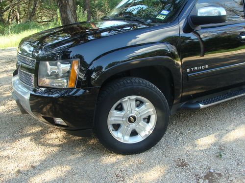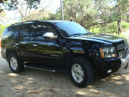 2007 Chevrolet Tahoe Z71 4dr SUV (5.3L 8Cyl) with Black Exterior, Black Interior. Loaded with 5.3L V8 OHV 16V FFV Engine, Leather Seats, 6 Passenger Seating, Third Row, Heated Front Seats, Power Front Seats, Driver Seat Memory, Power Glass Moonroof, Leather Steering Wheel Trim, Cruise Control, AM/FM/CD Audio System, Navigation System, Rear View Camera, DVD Entertainment System, Power Windows, Power Door Locks, Power Exterior Mirrors, Park Assist, Tow Package, Fog Lights, 18 Inch Alloy Wheels and more. |