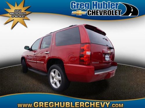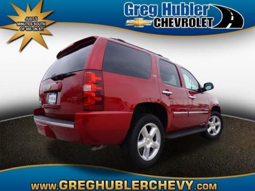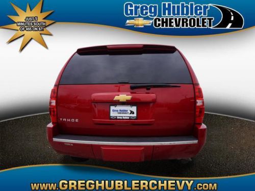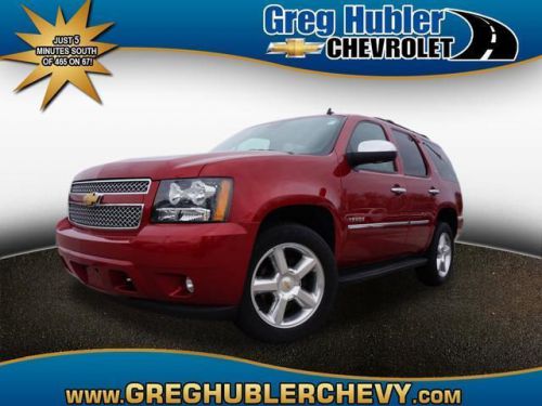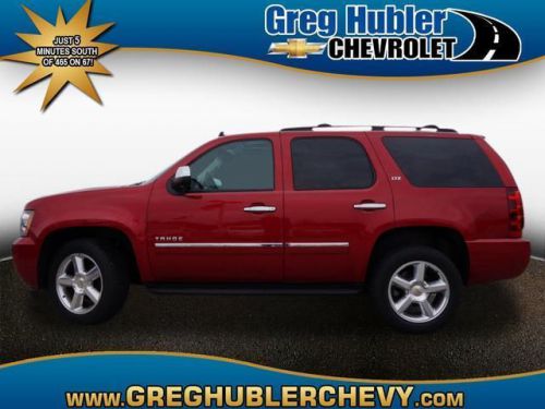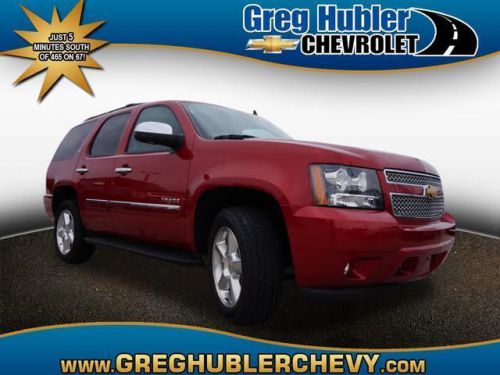 LTZ trim. REDUCED FROM $48,997!, PRICED TO MOVE $4,200 below NADA Retail! CARFAX 1-Owner, Excellent Condition. NAV, 3rd Row Seat, Heated Leather Seats, Overhead Airbag, Alloy Wheels, 4x4, Quad Seats, Tow Hitch. AND MORE!======KEY FEATURES INCLUDE: Leather Seats, Third Row Seat, 4x4, Quad Bucket Seats, Power Liftgate, Rear Air, Heated Driver Seat, Heated Rear Seat, Cooled Driver Seat, Back-Up Camera, Running Boards, Premium Sound System, Onboard Communications System, Trailer Hitch, Aluminum Wheels MP3 Player, Rear Seat Audio Controls, Remote Trunk Release, Privacy Glass, Keyless Entry. ======OPTION PACKAGES: SUNROOF, POWER, TILT-SLIDING with express-open and close and wind deflector, AUDIO SYSTEM WITH NAVIGATION, AM/FM/SIRIUSXM STEREO WITH CD PLAYER 7-inch touch-screen Color Interface Display (CID), 30 gig usable Hard Drive storage space, with navigation and voice recognition, USB port, MP3 playback capability, Radio Data System (RDS), speed-compensated volume, time shift recording capability (STD), ENGINE, VORTEC 5.3L V8 SFI FLEXFUEL with Active Fuel Management, capable of running on unleaded or up to 85% ethanol (with gas - 320 hp [238.6 kW] @ 5400 rpm, 335 lb-ft of torque [452.2 N-m] @ 4000 rpm, with E85 ethanol - 326 hp [243.1 kW] @ 5300 rpm, 348 lb-ft of torque [469.8 N-m] @ 4400 rpm), iron block (STD), LTZ PREFERRED EQUIPMENT GROUP includes standard equipment. Serviced here, Non-Smoker vehicle. ======AFFORDABLE: Reduced from $48, 997. This Tahoe is priced $4, 200 below NADA Retail. ======WHY BUY FROM US: While we make every effort to be sure that we are offering you the lowest price the first time, we are not perfect. If you find a lower advertised price somewhere else, simply print it out and bring it in, we will gladly match it for you. Pricing analysis performed on 6/16/2014. Horsepower calculations based on trim engine configuration. Please confirm the accuracy of the included equipment by calling us prior to purchase.