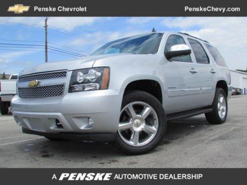 $2,100 below NADA Retail! LTZ trim, Silver Ice Metallic exterior and Ebony interior. CARFAX 1-Owner, Superb Condition, LOW MILES - 17,515! Navigation, 3rd Row Seat, Heated Leather Seats, Captains Chairs, Power Liftgate, 4x4, Overhead Airbag, Alloy Wheels, ENGINE, VORTEC 5.3L V8 SFI FLEXFUEL, LTZ PREFERRED EQUIPMENT GROUP, AUDIO SYSTEM WITH NAVIGATION, AM/FM/S..., Trailer Hitch, AUDIO SYSTEM WITH NAVIGATION, AM/FM/SIRIUSXM STEREO WITH CD PLAYER, There are lots of promises out there, but there's only one Penske Promise. AND MORE!EXCELLENT VALUEThis Tahoe is priced $2, 100 below NADA Retail. KEY FEATURES INCLUDELeather Seats, Third Row Seat, 4x4, Quad Bucket Seats, Power Liftgate, Rear Air, Heated Driver Seat, Heated Rear Seat, Cooled Driver Seat, Back-Up Camera, Running Boards, Premium Sound System, Onboard Communications System, Trailer Hitch, Aluminum Wheels. MP3 Player, Rear Seat Audio Controls, Remote Trunk Release, Privacy Glass, Keyless Entry. OPTION PACKAGESAUDIO SYSTEM WITH NAVIGATION, AM/FM/SIRIUSXM STEREO WITH CD PLAYER 7-inch touch-screen Color Interface Display (CID), 30 gig usable Hard Drive storage space, with navigation and voice recognition, USB port, MP3 playback capability, Radio Data System (RDS), speed-compensated volume, time shift recording capability (STD), ENGINE, VORTEC 5.3L V8 SFI FLEXFUEL with Active Fuel Management, capable of running on unleaded or up to 85% ethanol (with gas - 320 hp [238.6 kW] @ 5400 rpm, 335 lb-ft of torque [452.2 N-m] @ 4000 rpm, with E85 ethanol - 326 hp [243.1 kW] @ 5300 rpm, 348 lb-ft of torque [469.8 N-m] @ 4400 rpm), iron block (STD), LTZ PREFERRED EQUIPMENT GROUP includes standard equipment. LTZ with Silver Ice Metallic exterior and Ebony interior features a 8 Cylinder Engine with 320 HP at 5400 RPM*. Pricing analysis performed on 6/14/2014. Horsepower calculations based on trim engine configuration. Please confirm the accuracy of the included equipment by calling us prior to purchase. - This 2013 Chevro ... This vehicle is just a small representation of our inventory. We have many similar vehicles to the one you are looking for available. Please call me to discuss all your options. 99% Approval at www.penskeapproved.com.