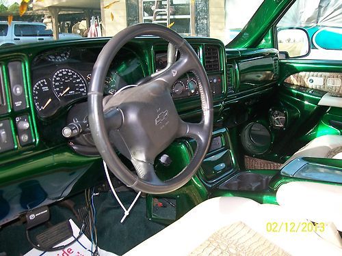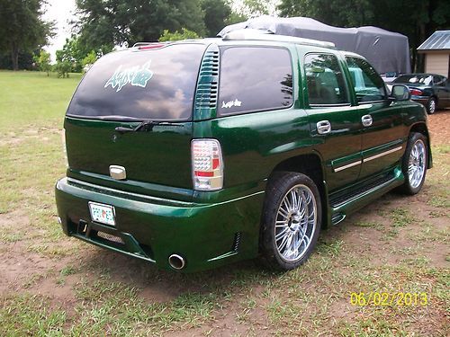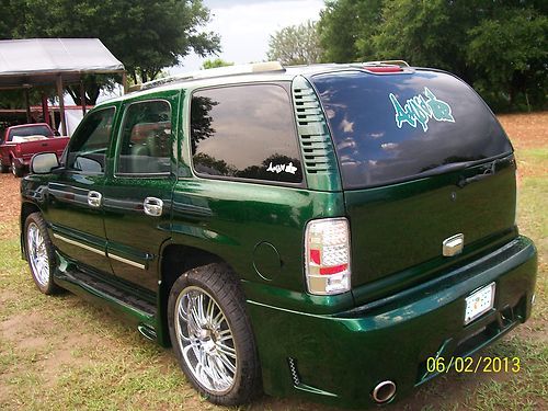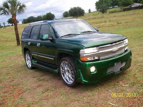 This Custom Tahoe offers custom exterior fiberglass work that ties in the dual exhaust, oversized Chevy Logo in grill, and running boards. Also custom interior fiberglass work includes rear, in door, and console speaker boxes. The cargo space has built in speaker box all painted to hold for 2 large subwoofers 4 speakers and amplifier space. There is custom boxes for speakers throughout the vehicle including all doors. Even has boxes under the hood behind the grill. This vehicle was designed to be a SHOW VEHICLE that displayed very high-end stereo equipment. The Amped Up logo on display shows what kind of speakers were in the vehicle. This was a personal show vehicle not ment for everyday use. That is why the vehicle has such low mileage. Hundereds of hours were spent dismantaling the interior of the car for custom paint fiberglass and leather work. The local upholstery shop quoted appox. $10k to duplicate the interior work alone. The vehicle has a total of over 40k dollars in upgrades including new 24' Status Rims and low profile tires. The 5.3L eng. is peppy but economical. Automatic Transmission has overdrive. Must see pictures to appreciate all of the work and upgrades to the vehicle.it is something chip foose would be proud of.When you drive this veh you have people pointing staring and when you open the doors out come the cameras.