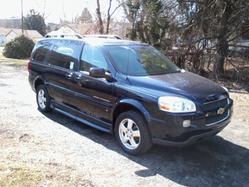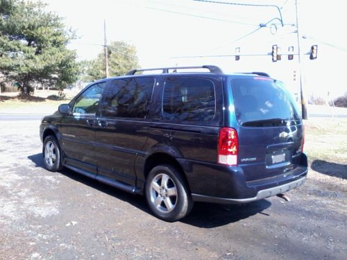 Offered by Kenny's Auto Sales is a locally traded Dark Blue with a very nice Gray Leather Interior 2007 Chevrolet Uplander LT Side Loading Braun Entervan Wheelchair Van with 131000 Highway Miles! This Van has been very well maintained and is in very good condition. These Vans have been known to run 300K or better so this one is not even broken in yet! It features a Lowered Floor, Remote Control Operated Power Passenger Side Loading Ramp and Power Side Doors, Removeable Front Seats and automatically adjusting rear suspension with four Q- straint Wheelchair tie downs as well as a shoulder harness for the wheelchair passenger. It is equip with a smooth running 3.9 V-6, Automatic Transmission, Gray Leather Interior, Power Drivers and Passsenger Seats. Power Windows and Locks Power Side Doors with Two Remote Entry Key Fobs, Front & Rear Air Conditioning and Heat, Rear DVD Player, Am/Fm CD Player, Cruise Control & Tilt Wheel and a Rear Proximity Warning System that beeps when another vehicle or object is close to the rear bumper. This Uplander Braun Entervan Runs and Drives Beautifully has been recently Serviced. The Brakes and Suspension are all in good condition and the Tire all have 3/32 or better tread left. This Van is ready to travel ! Our web address is the same as our eBay seller I.D. amtmobilityvans. Please call Kenny at 215-938-9333 with any questions. Kenny's Auto Sales, 820 Welsh Road, Huntingdon Valley Pa. 19006 Phone# 215-938-9333