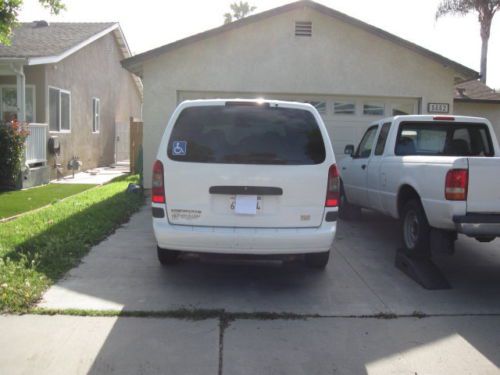 2002 Chevy Venture Handicap Wheelchair Van, Lowered Floor conversion , by Activan /Eldorado Coach ., Long Wheelbase.....This is the same model many disabled transit services use. For disabled passengers, does NOT have disabled driver hand controls, and not intended for same. Does have Ricon spring loaded ballanced side ramp , very easy to lift or swing and latch the ramp. Ramp swings out of the way for able bodied passengers...The ramp is NOT electric... Has removable front passenger seat , a very rare option for a handicap van, .....2 pass fold up middle row seat and 2 pass rear seat.... Power air lift rear suspension. Power windows, power side door , power door locks , w/ 2 remote controls, rear a/c . Has full size spare, Complete set of Q-Straint wheelchair straps, fire extingusher , safety triangles, original owners and conversion manuals.Tires good , New a/c compressor last year. Just passed California smog check, Ca Reg. just paid thru April 2015.......... We are the second owners, have had the van for 2 years.......Disabled family member passed away , so we don't need the van anymore.......................72,000 ORIGINAL MILES, YOU WILL NOT FIND ONE IN BETTER CONDITION !!!!!!!!!! ...SELLER STRONGLY SUGGETSTS HAVING AN INDEPENDENT INSPECTION BEFORE BIDDING!!!!!!!!!!!PAYMENT-$500 deposit by paypal within 24 hours , ballance within 7 days by certified check or cash in person. Seller will assist with shipping , only after full payment by cash or cleared certified check funds. No wire transfers, bitcoin , etc.......QUESTIONS ? PLEASE ASK BEFORE BIDDING , ASK A QUESTION THRU E-BAY OR CALL......310 589-5368 8AM-8PM PACIFIC TIME. Van is in Los Angeles county.